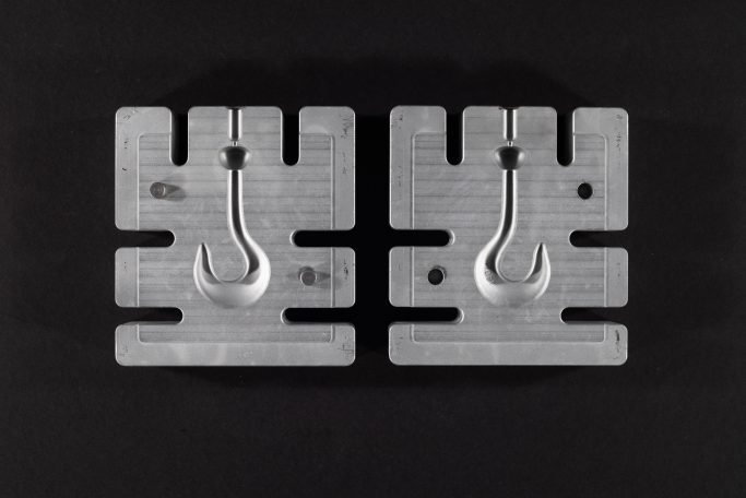 Die Garderobe besteht aus einer Holzschiene, in die Haken aus recyceltem Polypropylen eingeschoben werden.