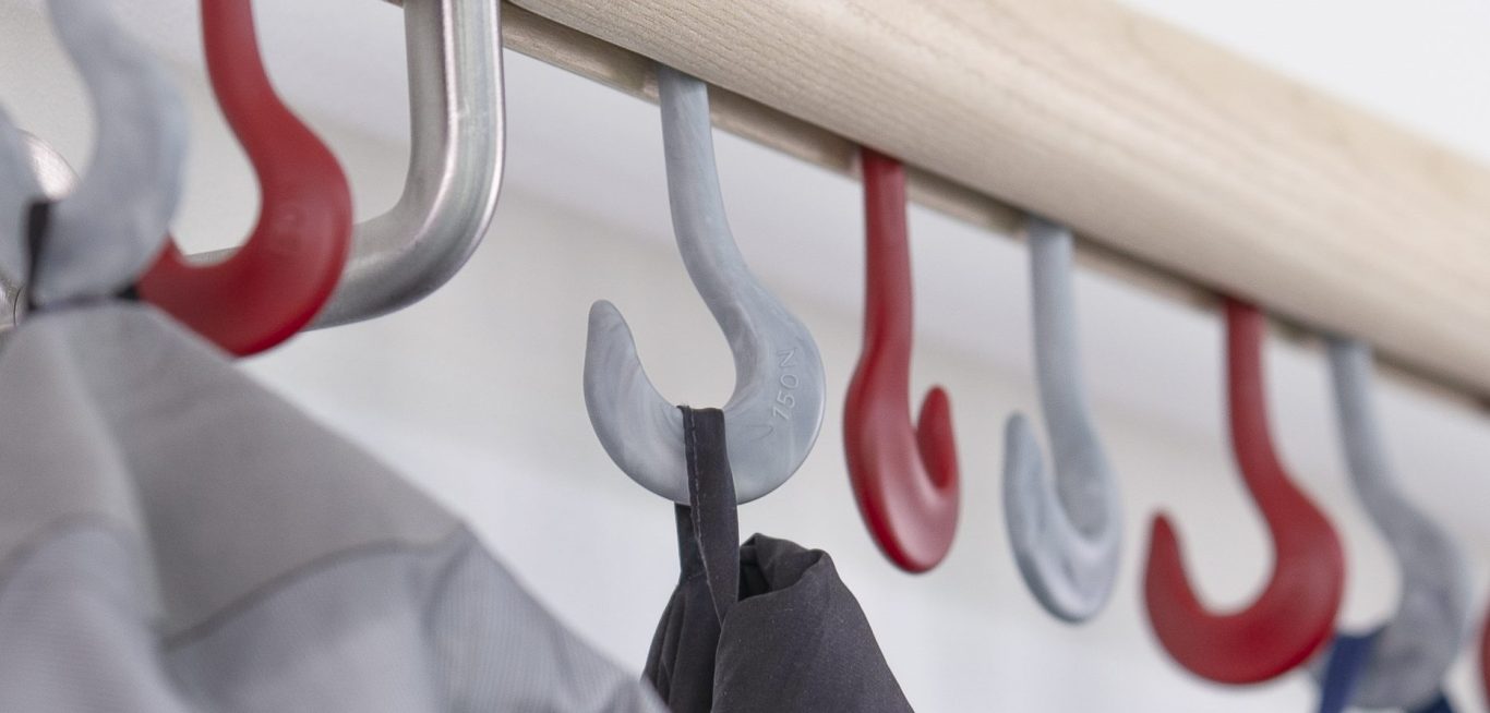 Das System erlaubt einfache Anpassung an die jeweilige Anforderung. Ob lange Leisten, viele farbenfrohe Haken für einen Kindergarten, oder kürzere Leisten, mit Haken in CI-Farben für die Firma.