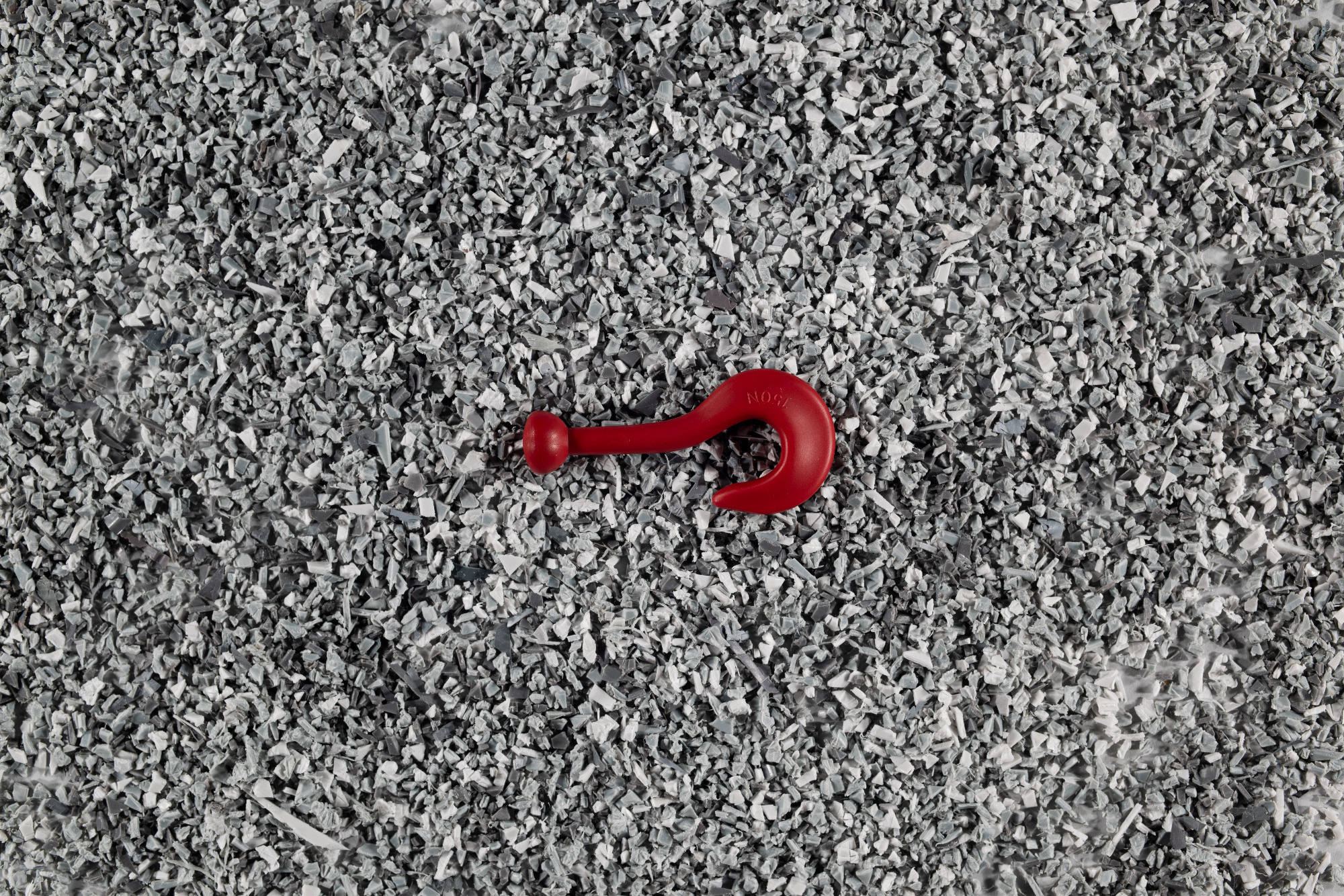 Die Garderobe besteht aus einer Holzschiene, in die Haken aus recyceltem Polypropylen eingeschoben werden.