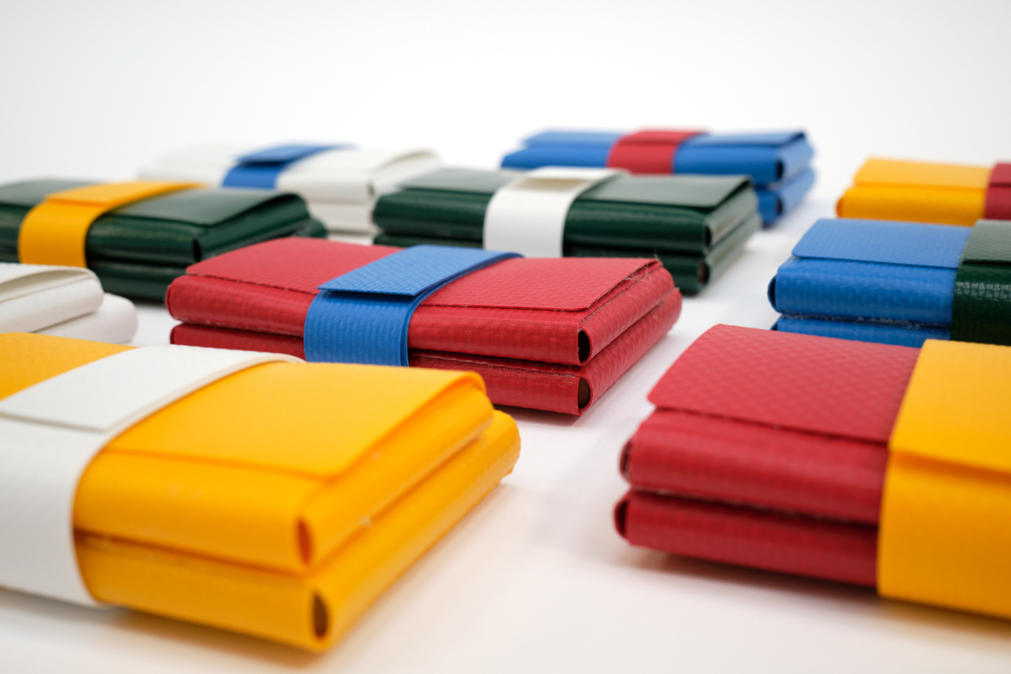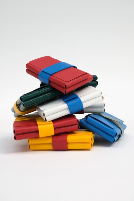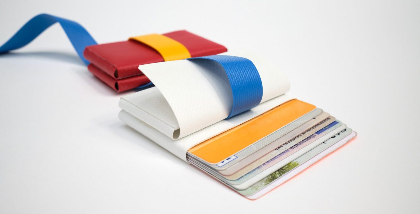 Ein kleiner Geldbeutel aus recycelten Lkw-Planen.