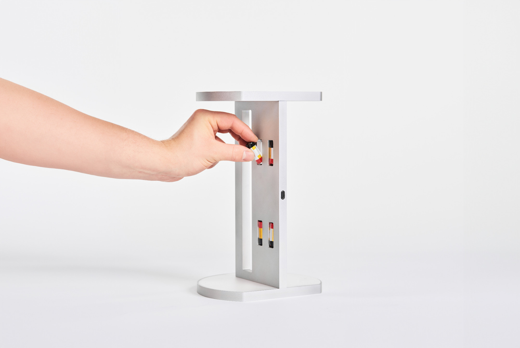 Die vier exponierten Akkus stammen aus recycelten Wegwerf-Vaporizern und lenken so auf die Thematik der Ressourcennutzung.