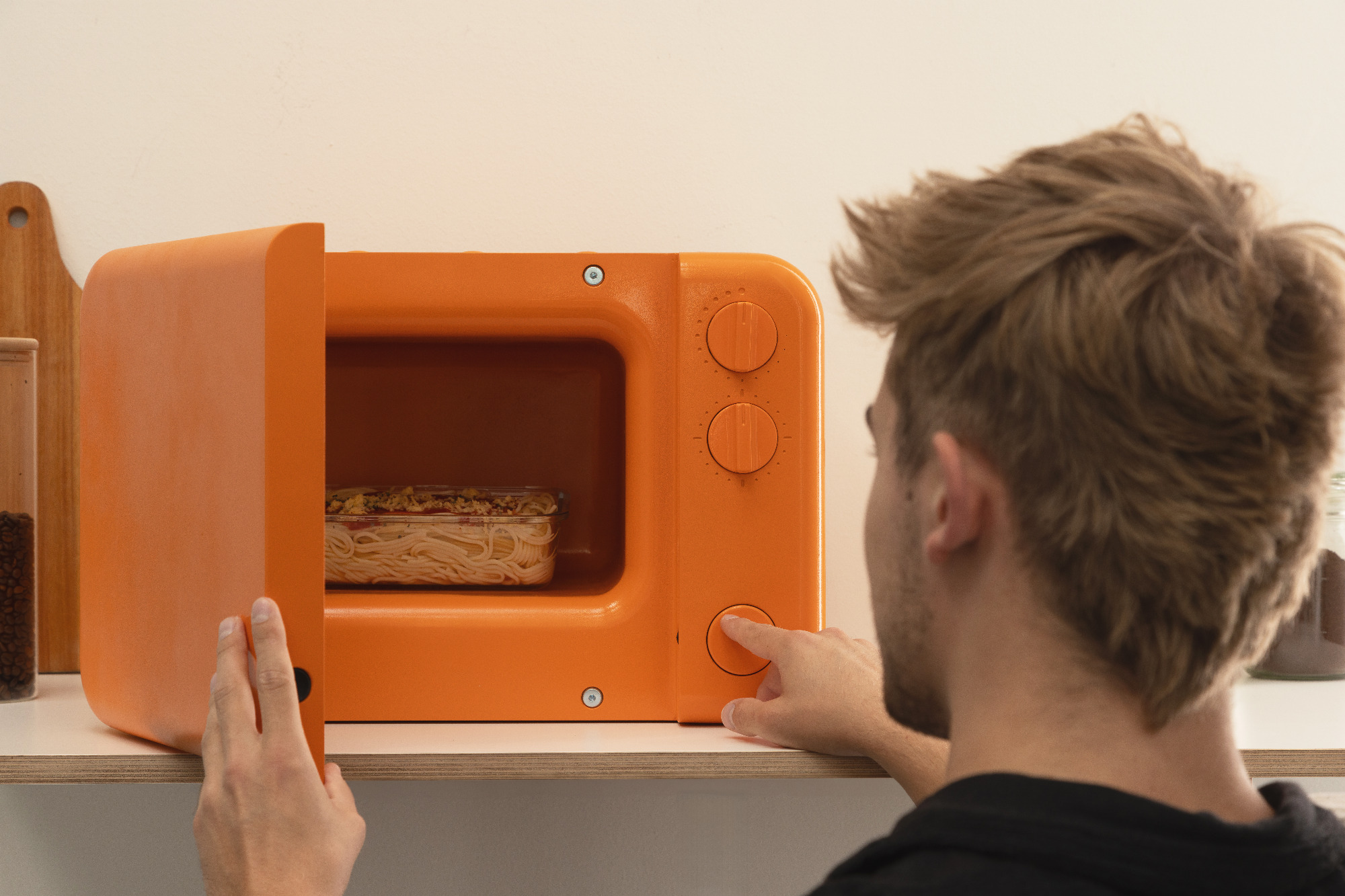 Konzeptioneller Entwurf einer Mikrowelle aus Keramik. Bearbeitet die Frage wie das Traditionsmaterial Keramik in modernem Gerät implementiert werden kann. Modellbau in Keramik und Holz.