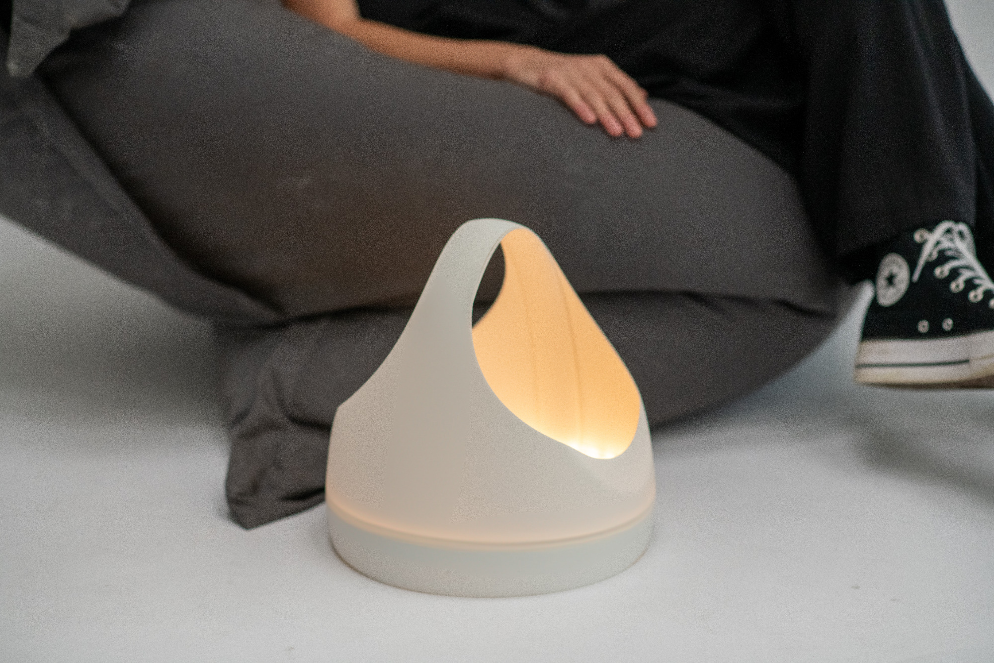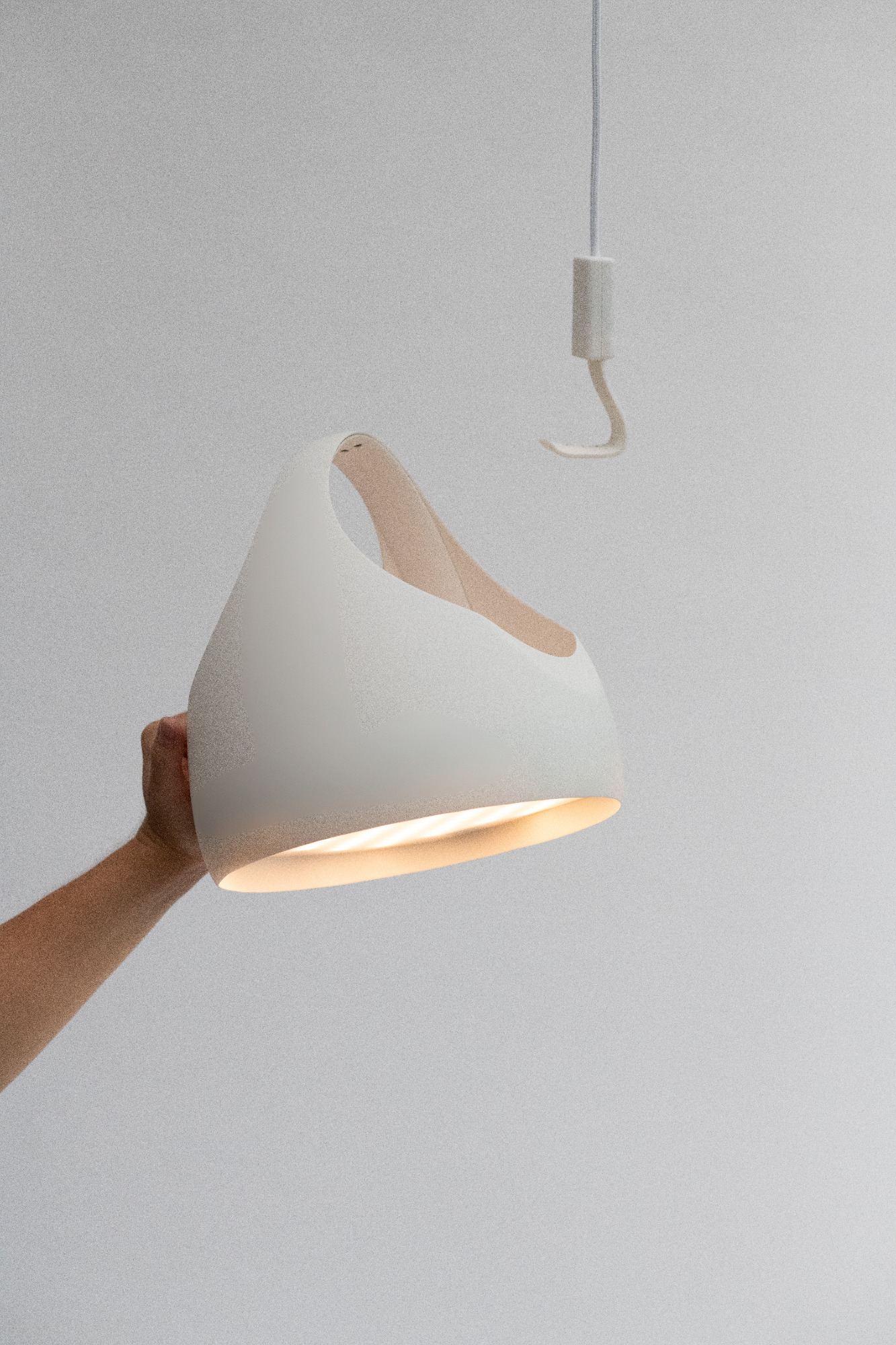 Konzept einer mobilen Pendelleuchte. Wird sie vom Haken genommen, kann sie an anderen Orten Licht spenden. Geladen wird sie über Kontakte auf dem Haken.