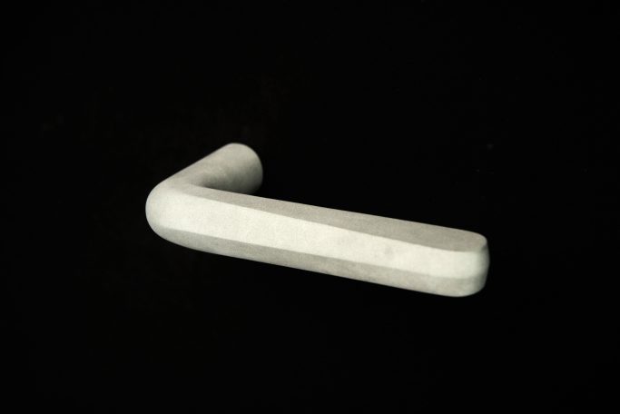 Eine Türklinke aus gegossenem Aluminium. Gestaltet nach den "vier Geboten des Greifens" von Otl Aicher - Daumenbremse, Zeigefingerkuhle, Ballenstütze und Greifvolumen, als zentrale Prinzipien für eine ergonomische Handhabe.